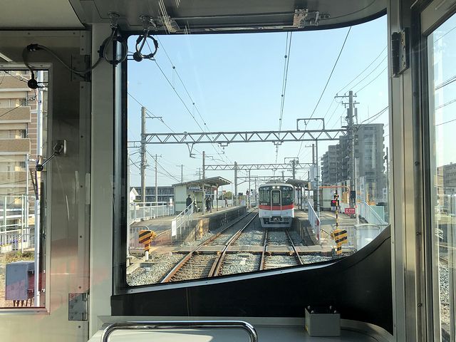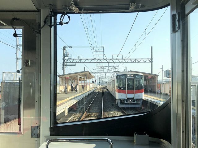 8人掛けのロングシートに5人程度の乗客を乗せ、列車は9時4分に飾磨駅を発車。先頭の運転台直後の席はシルバーシートになっていたため諦め、どうせ往復乗るのだからと、往路は普通に座っていこうかと。それで発車すると列車は築堤に登って高度を上げ、高架線をちょっとだけ走って高架駅の西飾磨駅に到着。ここで反対方向の列車と交換するのですが、その車両も6000系でした。