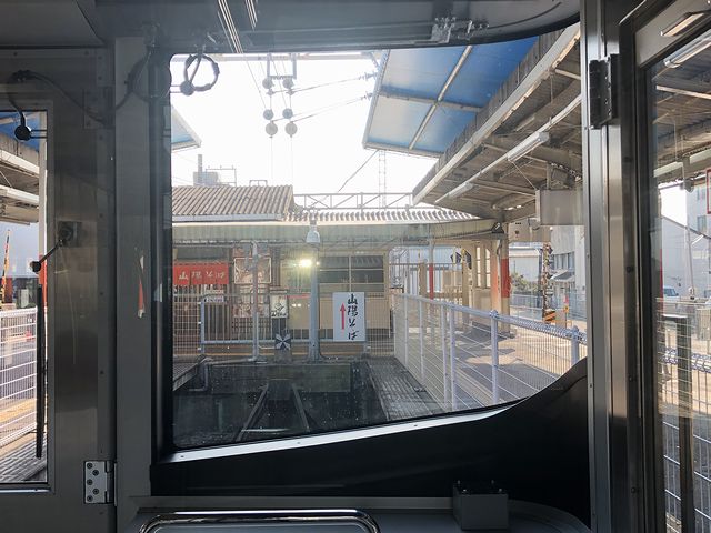 その後再び改札口から入って、乗ってきた列車の折返しとなる、9時27分発の飾磨駅普通列車に。復路は、先頭の6005(クモハ6000形)に乗り込んだところ、幸いな事に運転台直後の特等席が空いていたのでそこに座り、前面展望を堪能することに。