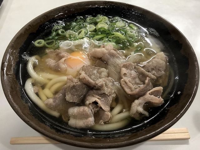 結構広い店内に入ると、平日の朝の9時半という中途半端な時間帯のせいか、先客はなし。注文は券売機で食券を買う方式ですが、先程の阪神そば以上に品数が多いですね。それで購入した食券を、お店のお姉さんに渡すとすぐに注文した月見うどんが登場しました。