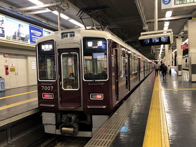 5時40分発の新開地行き普通列車は、既に梅田駅の9号線ホームに停車中。その車両は、厳つめの外観から新しい形式だと思ったのですが、最後尾に掲げられている車両番号は7007。ということは昭和55年(1980年)から昭和63年(1988年)にかけて210両も製造された、阪急で最も数が多い7000系のうち、昭和57年(1982年)に製造され、平成21年に大幅なリニューアル工事を受けた編成じゃないですか。