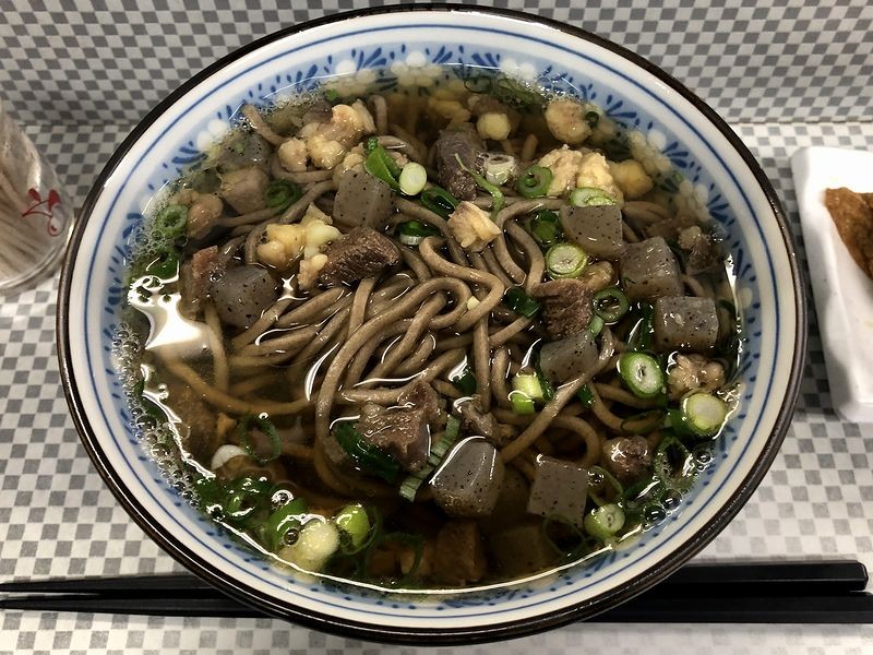 それでいただいたのが、牛スジとコンニャクを醤油とみりんなどで甘辛く煮た神戸の郷土料理「ぼっかけ」が載るぼっかけそば。つゆの出汁感はそこそこですが、あっさり上品な風味に、味付けもあっさりめ。また色黒のソバは茹で麺で、柔らかめの食感にツルツルっとした啜り心地。蕎麦の香りもそこそこありました。それと具のぼっかけは、食感はともかく、味的には脂があるにもかかわらずあまりガツンと主張せず、全体と馴染んでいるよう。それと一緒にいただいたいなりは、三角形の形状的から関西をだなぁ、と。また中の酢飯はお酢が強めに効いており、これまた関西のお稲荷さんに入っていることが多いゴマが、いい仕事をしていました。