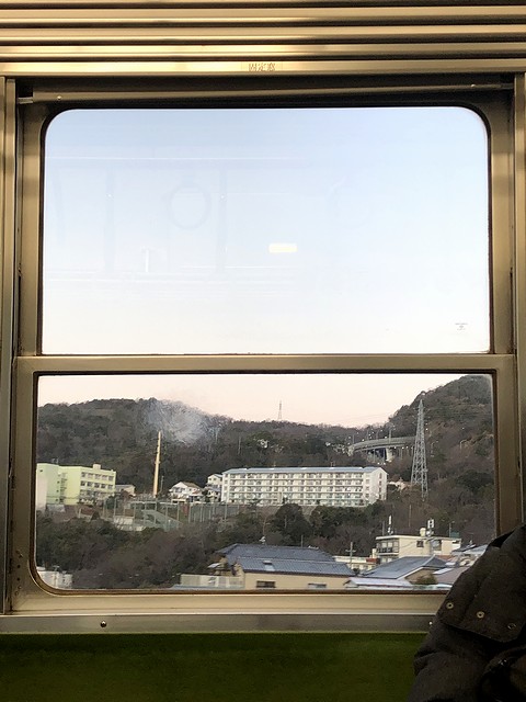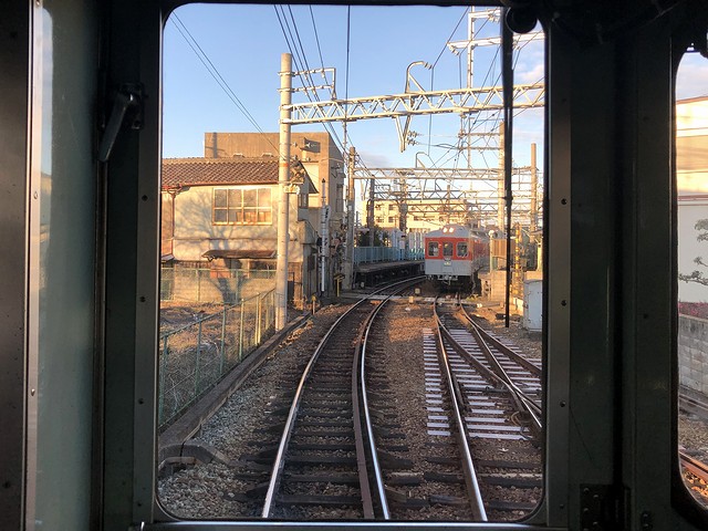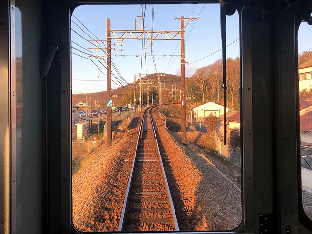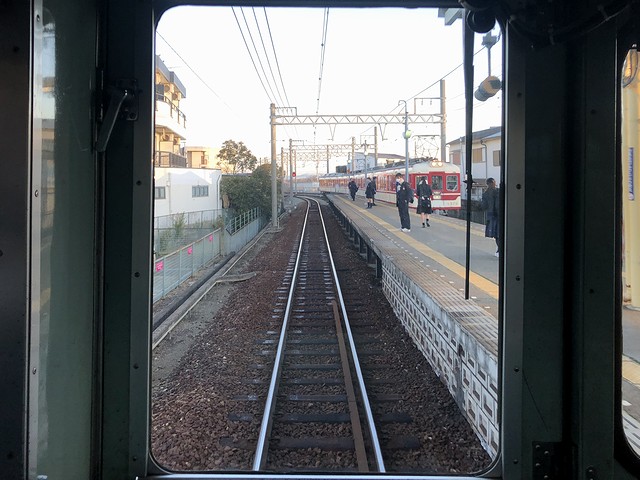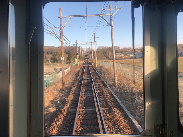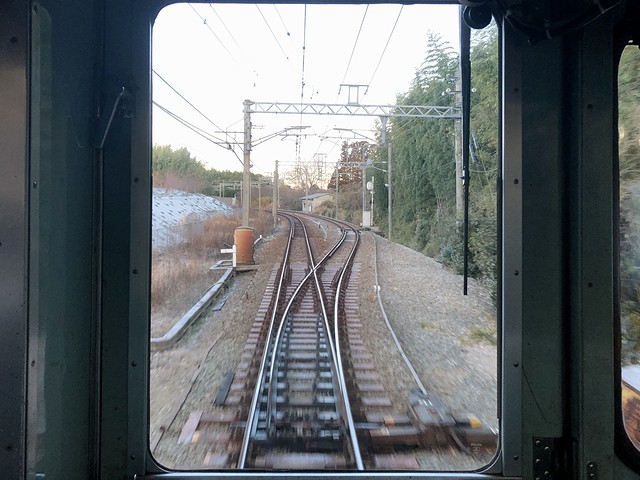 押部谷駅から先、線路は三たび単線に。線路の左側に並走する神戸に向かう県道は、激しく渋滞しています。次の緑ヶ丘駅では、構内に木製架線柱が。その後も木製のものをちょいちょい見かけました。で、このあたりからでしょうか、車内は通学の学生さんが増えだして、私の左右には女子高生が。その子らの親より多分年上なのにもかかわらず、運転席後ろでカメラ代わりのスマートフォンを構えていることに気恥ずかしさを覚えるのですが、まぁ、気にしても仕方ないというか。