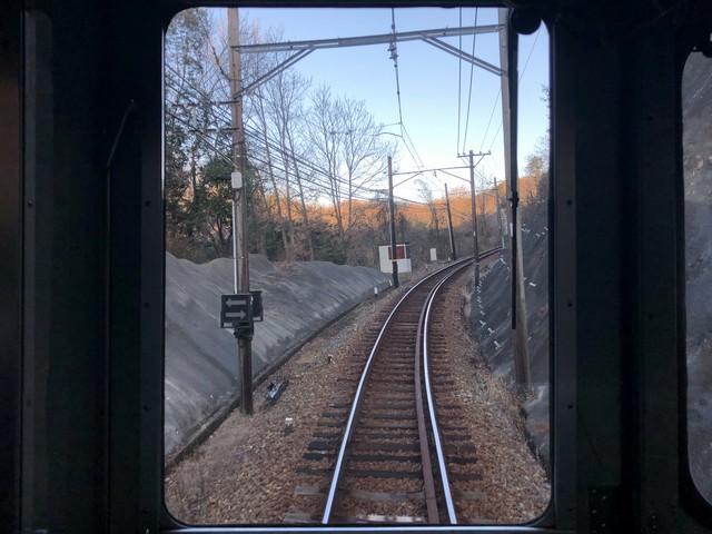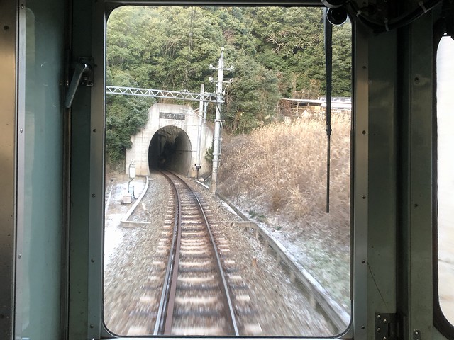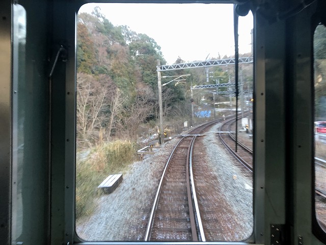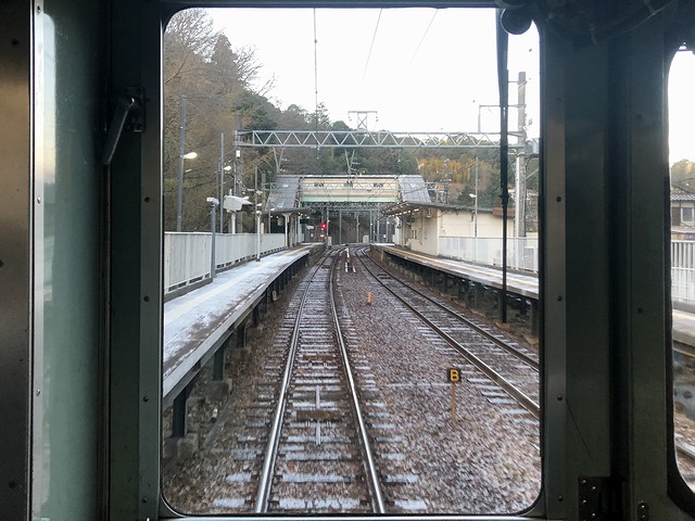 新開地駅を出てからこれまでは、何となくロングシートに座ってしまっていたのですが、ここからは気合を入れて、ちょうど空いていた運転台直後に立って前方を眺めることに。それで1分停車ののち鈴蘭台駅を発車した列車は、これから始まるラッシュ時に向けて出払ったのか車両があまり停まっていない鈴蘭台車庫の横を通ってから左にカーブしてトンネルを抜けた直後に停車する鈴蘭台西口駅は、駅構内から鈴蘭台駅側にかけて50‰の勾配がある駅。ちなみにこの駅の標高304mは、粟生線内で最も高いものとなっています。で、駅構内のホームを含め日陰になっているところは薄っすら白くなっていて、どうやら霜ではなく雪が降ったようですね。