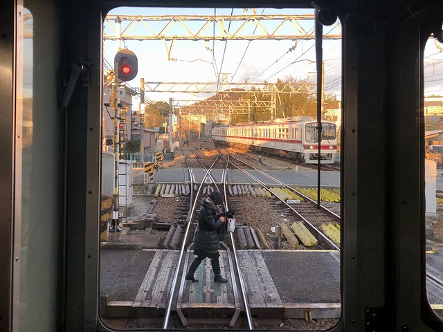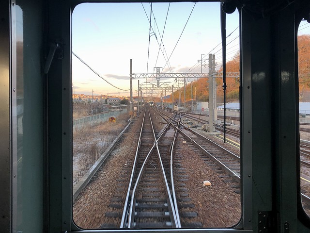 そんな中、車内は立つ人が少しという感じで列車は進み、木津駅を出た列車は、途中の見津信号場、そしてここも列車の姿がなかった見津車庫の横を通過して木幡駅に停車。それにしても、先程山は超えたと思ったのですが、線路は相変わらず勾配ばかりです。そして次の押部谷駅では、交換待ちしている列車を見つつ入線。新開地駅を出て30分、時刻は7時15分の定刻でした。それで5分停車の間にもう1本の列車と交換してから発車しましたが、駅員さんが走っている姿を見てなにかトラブルがあったのかと焦りました。(今日は列車が1本でも遅れると、予定した行程をこなせなくなるもので。)