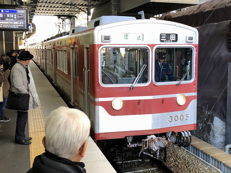 そんな有馬線を行くのが、9時10分発の三田(さんだ)行き準急列車。現在、有馬線を走る列車は、朝夕以外は途中の有馬口駅から三田線に直通運転されています。それでこの列車、本来は新開地駅始発なのですが、この鈴蘭台駅でイレギュラーな車両交換を行うとのこと。実質始発列車だと喜んで、通常は粟生線の列車が発着する4番線ホームで待っていると、入ってきたのは3000系という形式の車両の4両編成でした。
