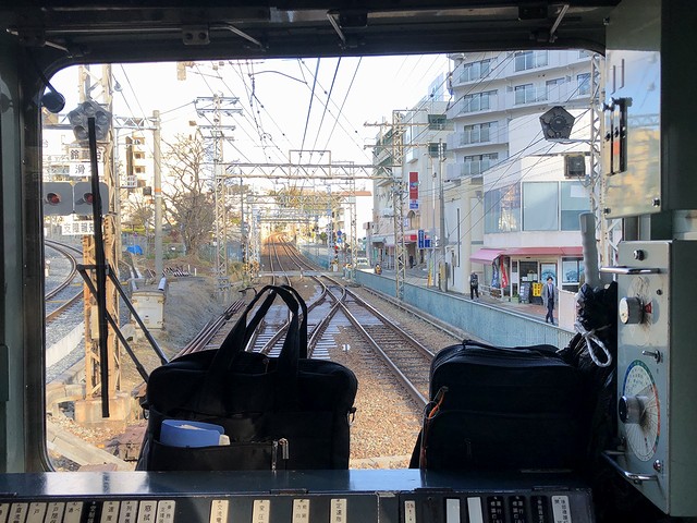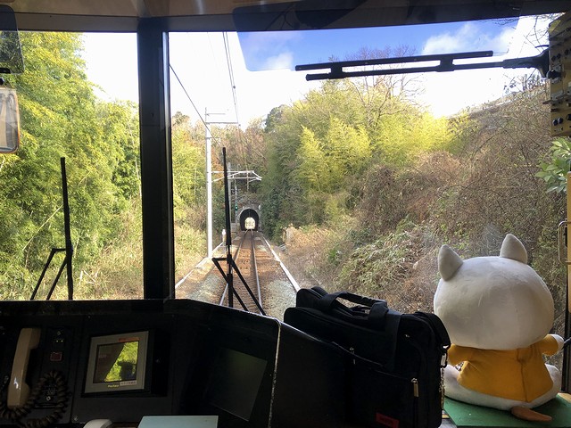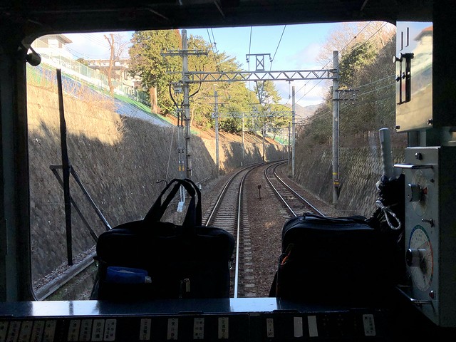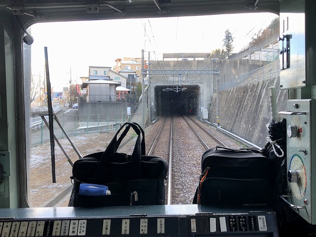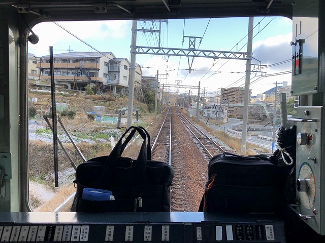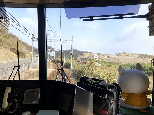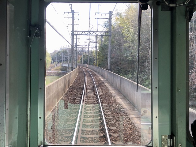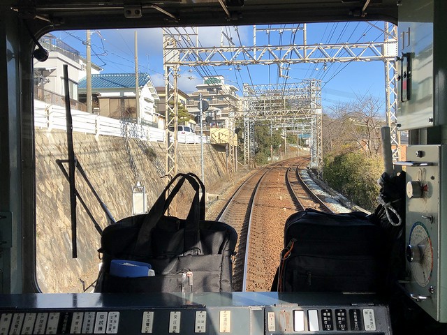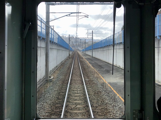 車両交換の影響か、若干遅れて鈴蘭台駅を発車。実質始発列車で、乗車列の先頭付近に居たため席にはありつけたのですが、この列車も運転台直後に立って前方の景色を楽しむことに。それで鈴蘭台駅出るとすぐに上り坂を登って北鈴蘭台駅に停車。標高346mと、神鉄の中で3番めに高いところにあるそうで。ここからは下り坂、しかも結構な急勾配となり、山の街駅、箕谷駅と停車。箕谷駅の標高は244mで、北鈴蘭台駅から2.6kmで100m以上降るんですね。で、そんな坂道を登り降りしているにもかかわらず、線路の周りに開けたというか民家が建っている場所が多い印象。また深くはないものの掘割になっている箇所も多く、山肌を削って勾配をならしつつ建設した苦労が忍ばれます。
