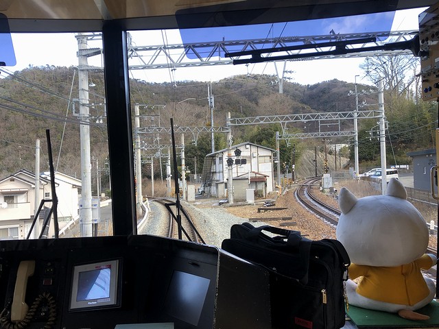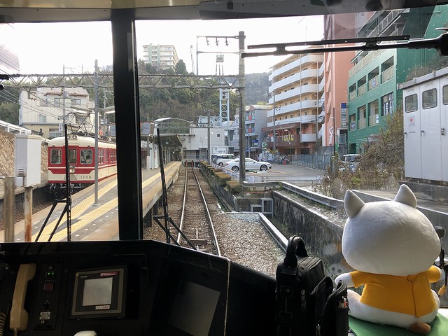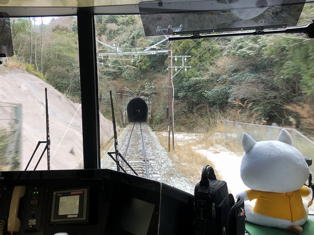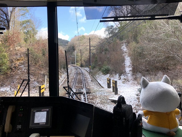 その先頭車の2003(2000形)に乗り込み程なくして発車。この列車でも、運転席直後に立つことにしたのですが、その運転席にはマスコットの「しんちゃん」が鎮座ましましていました。それで列車は、標高293mの有馬口駅から、神鉄で最も高いところにある標高357mの有馬温泉駅まで、ずっと上り坂を登る感じで。線路も単線となり、架線柱は木製や古レールを使ったと思われる古いタイプのものが。そして前方の消景色は山深く、場所によっては雪化粧が残っています。そして廃止となった新有馬駅の跡を過ぎるとトンネルに入り、抜けたところが有馬温泉駅で、有馬口駅から約4分、9時38分の到着。向かいのホームには、先発の有馬口行きとなる、1000系電車が停まっていました。