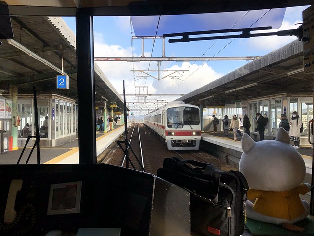 有馬温泉駅では、これから旅館やホテルに出勤するのでしょうか?小奇麗なお姉さんたちと下車。それで先発の有馬口行きが発車するまで1分しかないので無理はせず、乗ってきた列車の折返しとなる9時54分発の列車で戻ることに。で、その発車までの約15分間で、有名な有馬温泉の、せめて駅周辺の散策だけでもしようと思っていたのですが、風が強く吹きつけ風花も舞っている、要はとっても寒いため、駅舎の写真だけ撮ってすぐに戻り、列車の中で発車を待つことに。