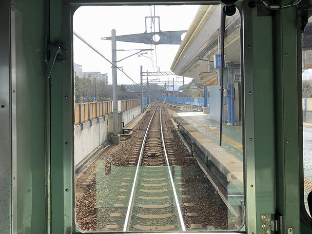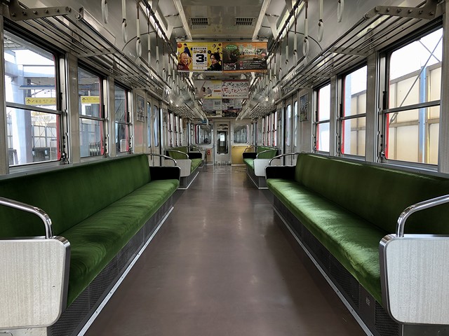 それでこの3000系。昭和48年(1973年)から平成3年(1991年)にかけて(一時中断しながらも)導入された車両で、全長約18m、片側3箇所の両開き扉を持ち車内はロングシートという車体や、抵抗制御の主電動機といった機構は先に導入が開始された1000系と同様ながら、4両固定編成、アルミ合金製車体、新製時からの冷房装置搭載、多段制御、定速運転機能などの新基軸が盛り込まれました。それで現在は、製造された9編成のうち7編成が現存しているのですが、乗り込んだ先頭の3005(3000形)を含む編成は、昭和50年(1975年)に製造されたようで。