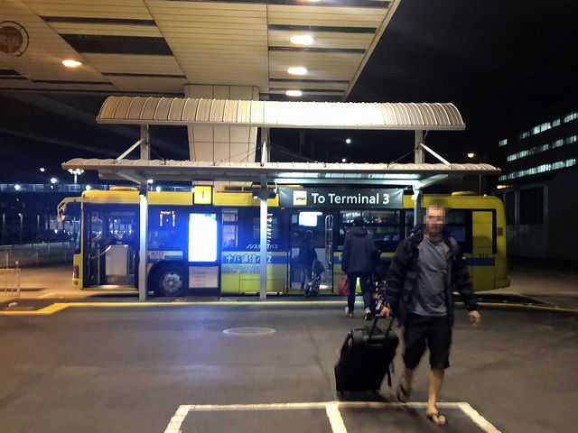 成田空港第2ビル駅に到着後、地下のホームから地上に出て、第3ターミナル行きの連絡バスに乗車。タイミング良く、乗車してあまり待たずに発車しました。車内は時間帯のせいか余裕で座れる状態。もっとも、ドア付近に立ってる人もわりといるますが。で、3分ほどで第3ターミナルへと到着しました。