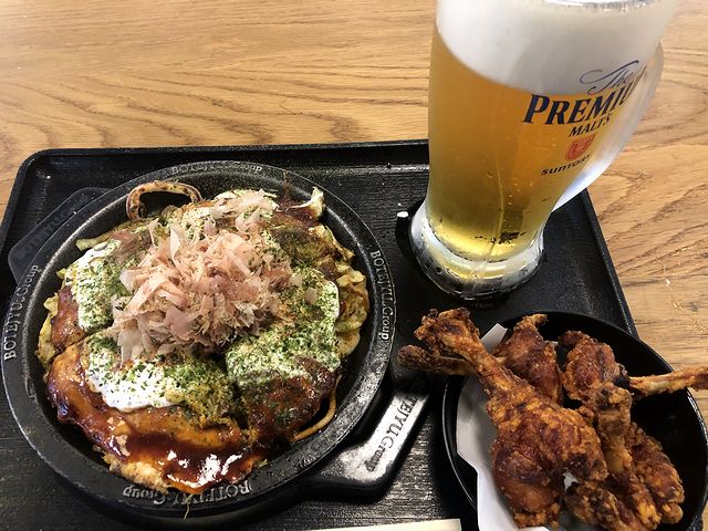 第3ターミナルに到着後、飛行機の出発まで、まだ1時間半近くあるので、予定どおりここのフードコートで夕食。いただくお店は既に決めていて、有名お好み焼き店にへと。今回、大阪・兵庫に行くにもかかわらず、粉物のお店に行く予定が、この時点では全くなかったもので。そこでモダン焼きとからあげ、そして生ビールを注文。注文を受けてから焼き始めるらしく、「10分程お時間いただきます。」とのことでしたが、概ねそのとおりの時間で呼び出しブザーが。それを受け取り、外国人旅行者でに囲まれながらいただくと、インターナショナルな旅の気分が何とも盛り上がってまいりました。もっとも、私がこれから飛ぶのは関西国際空港なんですがね。
