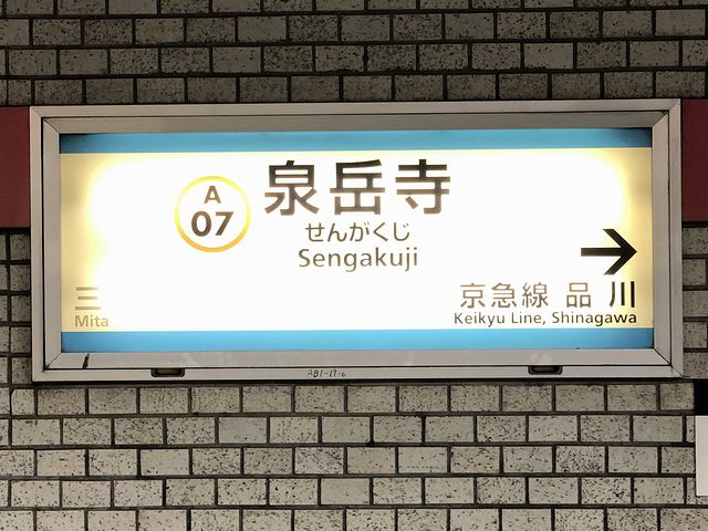 今回の京急(と横浜シーサイドライン)の旅は、泉岳寺駅からスタート。駅名標は京急式ではなく、都営地下鉄式なんですね。