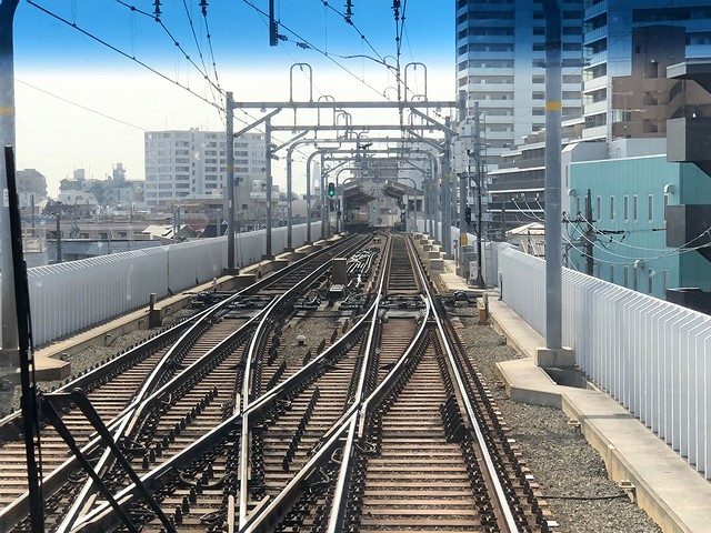 30秒の停車時間で慌ただしく京急蒲田駅の3階を発車した列車は、まだホームの途中という位置のポイントで分岐して左に急カーブ。その直後、高度を下げて2階からの線路と合流するのですが、この時点では通常と逆の右側通行になっており、糀谷駅手前に設けられたダブルクロッシング(正式には「シーサースクロッシング」と言うらしいです)で転線して左側通行に。このダブルクロッシングと転線はさして珍しくもないとは思うのですが、空港線に初めて乗った時に何故か驚いた記憶があったりして。