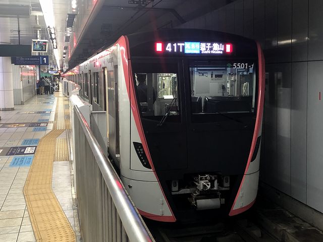 この5500系。平成30年(2017年)に運用を開始した都営浅草線最新の車両で、都営地下鉄浅草線乗り入れ規格に基づいた全長18m、片側3扉の車体に、車内はロングシート、主電動機はVVVFインバータ制御という車両。車両番号を見たところ、そのトップナンバー編成のようで、後ろから2両目の5501-2(5500-2形)という車両に乗り込んだところ、車内は所々に「和」を感じる意匠が盛り込まれているとの事ですが、それらが結構目立ちますね。