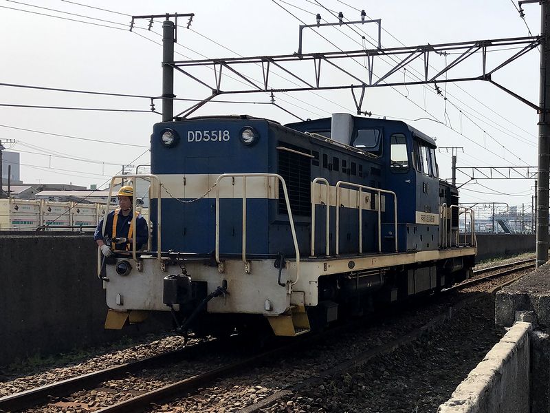 小島新田駅では一度改札口から出て、そこににあった売店で水を購入。すると、ディーゼル機関車の音が聞こえてきたので、音の方へと近づいてみると、神奈川臨海鉄道のDD55形機関車が、ちょうど走ってくるところでした。