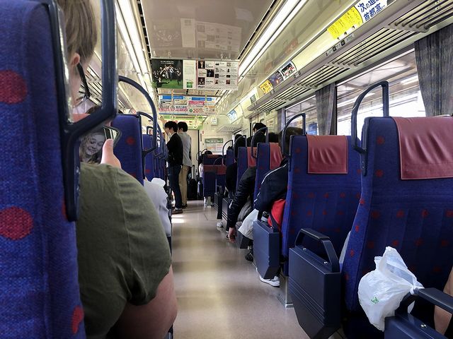 品川駅では少々乗客を増やし、8人掛けのロングシートに5,6人位座っている状態に。またドア付近には、で立つ人も少し出ました。で、品川駅から先は、何度か乗ったので多少見覚えのある景色の中を。そんな中、かつて何度か降りた大井競馬場最寄りの立会川駅、平和島駅と、1~3分ごとに停車しますが、その間に駅を1つ2つ通過しています。で、平和島駅で特等席が空いたので、いそいそと移動。