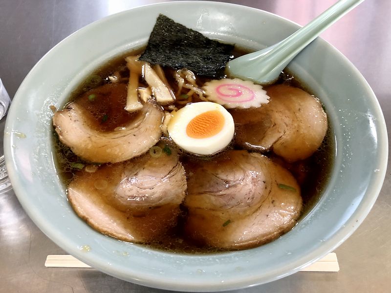まずはその、色が黒いスープからいってみたところ、出汁は動物系メインでしょうか?それらの旨味が良く出ていて、また見た目どおり、醤油の風味は濃い目。もっとも、塩気はそれほど強くなく、個人的には丁度良いくらいですした。そして、手打ちという縮れ麺は、佐野というよりも白河っぽい食感というか、ピロピロというより、柔らかい中にモチっとしたヌクヌク感のあるなめっこい触感がいいですね。スープとも良く馴染みます。また具のチャーシューは、バラ肉?をΩ状に巻いたタイプでしたが、柔らかく仕上がっていて、味付けは薄めなため、肉の味が楽しめます。チャーシューメンということで、贅沢して麺と一緒に口に入れると、これがまた良いですね。あと他の具は、メンマの他、ナルトが個人的には嬉しく、更にゆで卵が泣かせます。