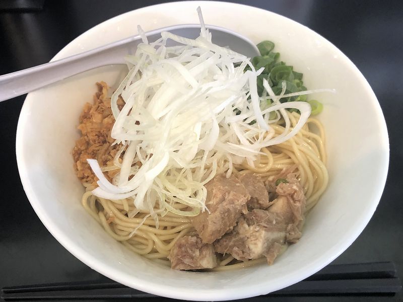 それがこの、冷鯛(つめたい)油そば。麺がサービス良く丼にみっちり入っている(中華そばの1.5倍とのこと)ので若干混ぜづらかったのですが、それでも何とか良く混ぜてからいただけば、最初に感じるのは、マジで鯛というか、鯛風味がブワっと。混ぜる前、鯛の姿はどこにもなかったにもかかわらず、しっかりと主張してきます。また、冷たく締められた細ストレート麺は、低加水ゆえ弾力は控えめですが、ゴワムチっとした歯ごたえが良く、そこにこれまた良い感じで油というかタレが絡みます。ちなみに、味の濃さは適度で、油そばだけあって油感は結構ありますね。そして具は、中華そばの低温調理のとは別物の、角切りチャーシュー。ショウガのような風味があって、ホロホロの食感なので麺に絡みやすいです。それとフライドオニオンは、香ばしクリスピー。青ネギ、白ネギといった2種類のネギも良く、これらがタレと相まって、最小限の構成で効果は抜群という感じじゃないでしょうか。それで麺を食べ終わると、丼の底にはタレがわずかに残っるのですが、コメを入れたい誘惑に駆られました。(CONTINUEでも良いかもしれません。)