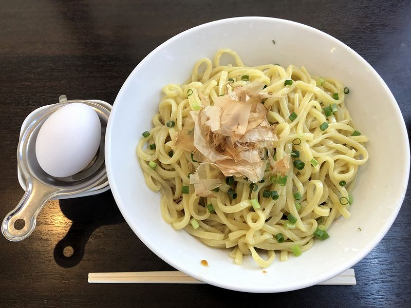 その品がこの、冷やしかま玉ラーメン。写真のとおり、器には鰹節と青ネギが掛かった平打麺が入り、そこにエッグセパレーター付きの生玉子が付くという構成で登場しました。それでせっかくのセパレーターなので卵黄のみを麺の上に投下してから全体を混ぜてズルズルっといけば、麺は流水締めくらいの温度でしょうか、ピロっと感ありつつシコシコっとした歯応えも強いですね。ただ、麺の長さがわりと長めなので、あんまり欲張って口に入れないほうが良いかもしれません。そして麺によく絡むタレは、油感はあまりないけど煮干しは結構強めに香ります。また味が濃い目だったのと勿体なかったので、途中から白身も投入してしまったのですが、麺大盛りだと生卵はも1つ追加しても良かったかもしれません。っていうか、その生卵を含め、この品専用のお品書きには、色んなトッピングも書いてありましたが、それらを追加しても良さげでしたね。で、サッパリまろやかにツルッと麺をいった後は、残ったタレに、この日は平日でサービスだったミニごはんを投入すると、凝ったTKGという感じでこれもまた良かったです。