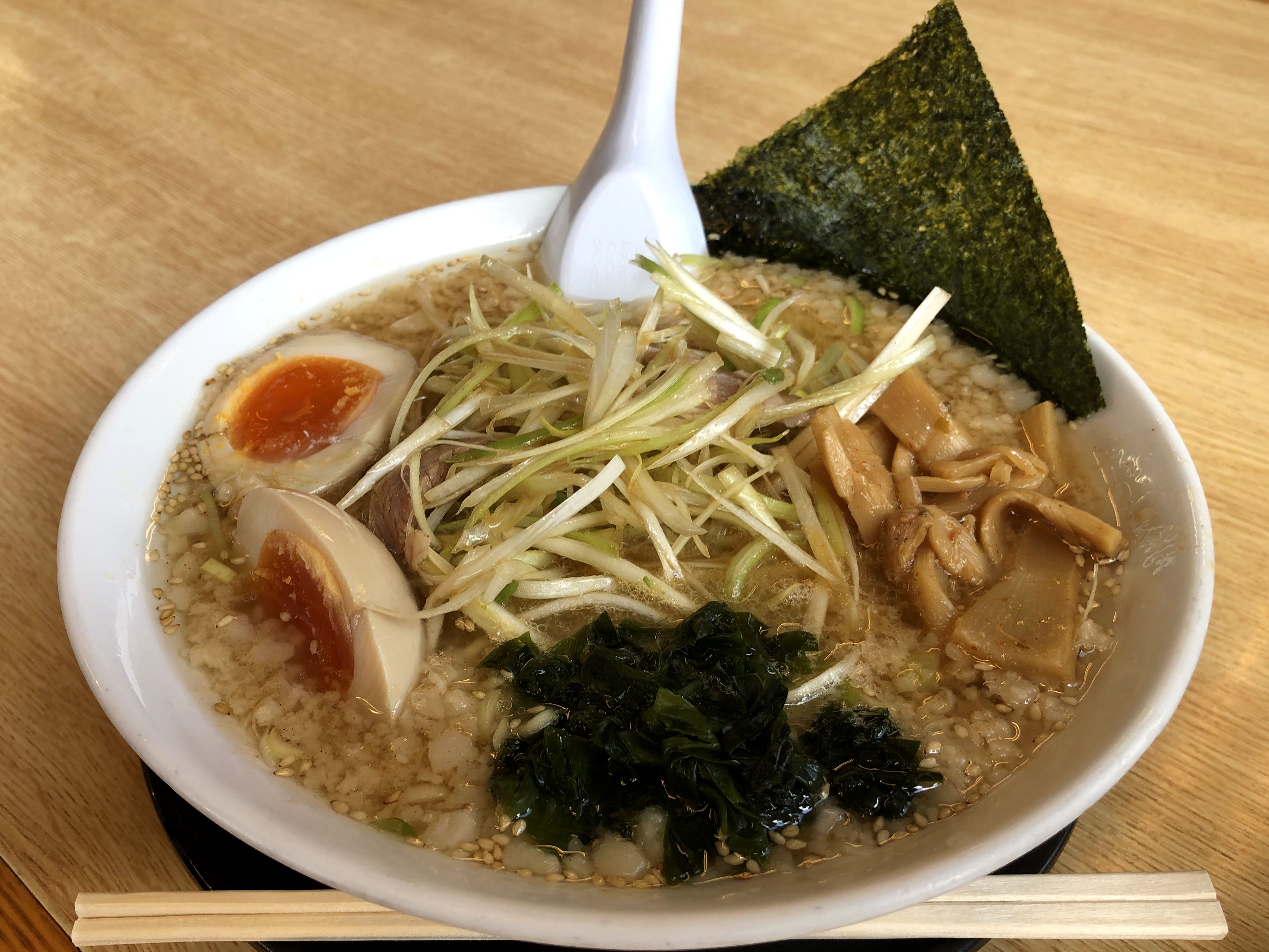 それで籍についてすぐに食券を提出し、サービスのキムチをいただきつつ待つこと少々で登場したのがこの、背脂ネギ味噌ラーメンに味付玉子を追加したもの。早速スープからいってみたところ、背脂のコッテリ感、濃い目に効かされた味噌ダレ、スープの豚骨感と旨味、全てが暴力的(褒め言葉です!)で、何とも良いですね。そこに、ニンニクをスプーン山盛り1杯投入。今回は落としてからは混ぜ込まない爆撃方式ではなく、レンゲにとってスープに溶かしたものを全体にふりかけて味を落ち着ける感じに。(冷静に考えると、生のおろしニンニク入れて落ち着けるって、明らかに変なんですがね。)そして、啜り心地が若干モソっとしてるけど歯ごたえがある細めの自家製ラーショ麺を啜れば、これが、もう。更に、ザキザキしたネギとそれに混ざる柔らかなチャーシューも一緒に口にいれれば、また。たまに柔らかなワカメや、追加した火の通り加減・味加減とも良い感じの味玉もいただき、更に麺とスープをズルズル。ほんと、腹具合を考えなければ、ずっと食べていたいくらいです。