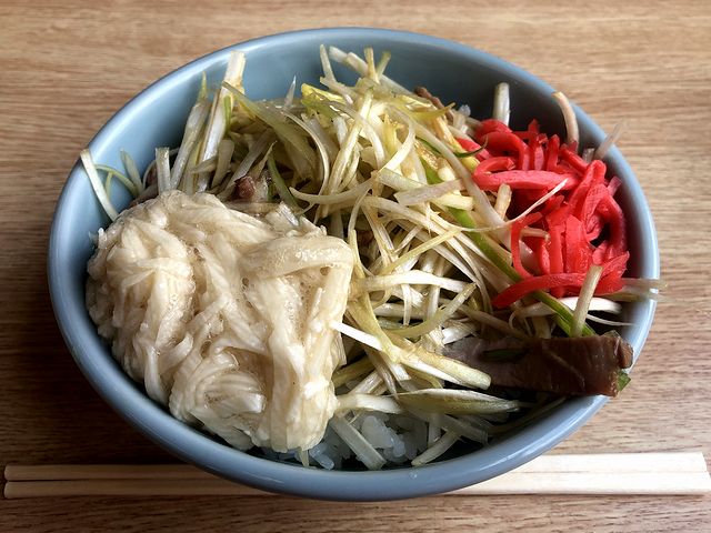 こちらは、一緒にいただいた品。もちろん、アタマ悪く「たべたいものをたべる。」ことにしたので、ネギが被っても気にしないというか。で、暴力的なスープが無い分、ネギの味付けがよく分かるのですが、改めて味わうと、コショウが結構効いてるんですね。更に、スープにたっぷり浮く背脂を掛けて、ラーメンの海苔を移植してトロロと共にかっこめば、これがいい意味で危険な味でした。
