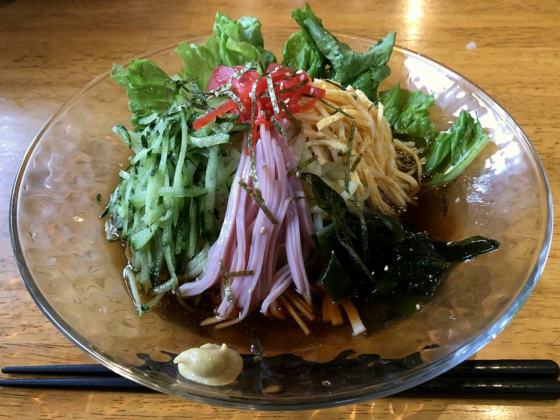 それで今回、こちらのお店にお伺いしたのが、今年はあまりいただく機会が無かった冷やし中華。見た目は(お品書きに写真があるので知っていたのですが)わりとベーシックな感じです。で、登場してまず、全体を軽く混ぜてからいってみたところ、タレもベーシックな醤油味。味付けはお酢のエッジがかなり効いたタイプで、暑い日にはぴったりだと思います。(もっともこの日は、曇り空で微妙な気温だったのですが。)そして何より印象的なのは、茹でたあと締められたことでツルツル感・シコシコ感ともマシマシになった平打ち麺。元々、こちらのお店の麺は好きなのですが、冷やし中華だと更に良くなりますね。そして具は、ハム、キュウリ、そして自家製っぽい錦糸卵が嬉しいところ。レタスやワカメも相性が良いですし、刻み海苔や白ゴマ、紅ショウガは良いアクセントになっています。