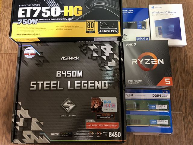 CPUは最近日本でも発売が始まった廉価版のモデルをチョイス。実はRyzen 3 3300Xという選択肢もあったんですが、品薄で買えなかったんですよね。それとマザーボードは昨年メインマシンを組む際に使用を検討した(けど結局ベアボーンを使ってしまった)もの。この次世代のB550チップセットを搭載した「Steel Legend」も出ていたのですが、価格重視で旧世代に。一方、メモリはあまり価格差がなかったことから定番のPC2666ではなくPC3200に。容量はこれの倍あっても良かったかもしれなかったのですが、変なところでケチってしまったというか。またCドライブにするSSDは、自分用では初めてのNVMe。ところでヒートシンク、付けたほうが良いんですかね。あとある意味一番悩んだのが電源。電源容量を計算できるウェブサイトで試算したところ700Wだとギリ足りないようだったので750Wの品にしたのですが、その中でも、どのあたりまでお金をかけるべきか。結局、80PLUS GOLD認証品のなかから、この時自分の環境で買える一番安い品という選び方をしてしまったんですが。
