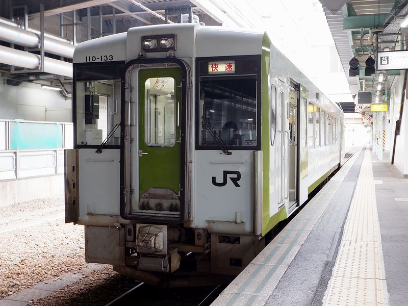 そんな山田線の全線を走る快速リアスは13時33分頃、2番線ホームに入線。車両は昨日、石巻線などで乗ったキハ110系100番台です。