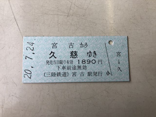 宮古駅に到着して列車を降りたらすぐ、一度改札口を出て三陸鉄道の切符売場に。そこで久慈駅までの切符を買うと同時に、朝来た時に貰わなかった三陸鉄道の鉄印を。ここの窓口で買うと、硬券が出てくるんですね。で、鉄印を貰い終える頃、私の後ろは行列になっていました。そして次に乗る、16時32分発の三陸鉄道リアス線久慈行普通列車はまだ改札が始まっていなかったので、改札口付近に何となく出来ていた行列に、朝いただいた時とは別の品を試してみたい気もした駅そばを蹴って並ぶことに。というのも、これから乗る区間は、盛駅から宮古駅までのリアス式海岸と違う海岸段丘の上を列車は走るようになり、是非とも海側の窓側に座ってそこからの景色を眺めたいと思っていたからでして。