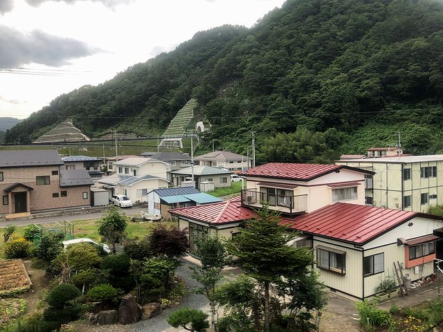 それと区界駅を通過するともう一つ山田線と並走するのが、閉伊川水系の閉伊川。っていうか、山田線はここから先、この閉伊川が造った谷におおむね沿うかたちで線路が引かれています。しかしこの閉伊川、先に乗った釜石線の猿ヶ石川と違って平地はあまり造ってくれなかったようで、川沿いの農地も、釜石線沿線はほ場整備された水田が多かったのですが、こっちは小規模な水田で、中には耕作放棄地もありました。それでそれらを眺めつつ列車は相変わらずノンストップ区間を走行中、川内駅で派手な塗装の列車と交換。コロナ禍によって7月はじめまで運休を余儀なくされた臨時列車の快速さんりくトレイン宮古で、「リゾートあすなろ」という車両が使われています。