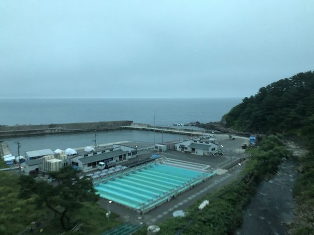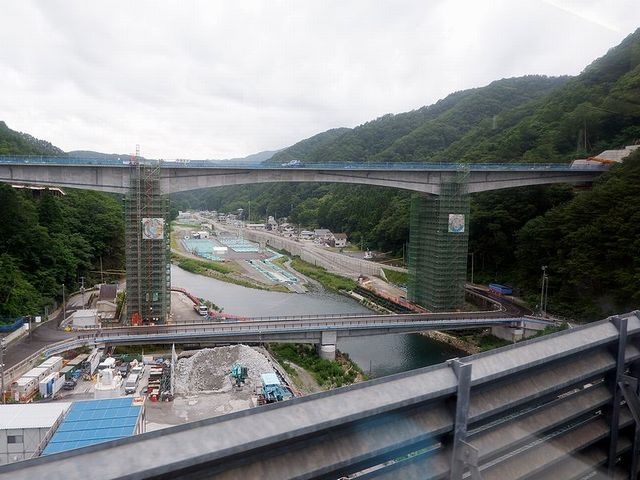 列車はトンネルをいくつも抜け、それにより窓も曇ったり(長大トンネルに入るとだいたい曇る)曇りが取れたりを繰り返しつつ進みます。途中、堀内(ほりない)駅の前後にある大沢橋梁、安家川(あっかがわ)橋梁といった景色の良いところでは一時停止して案内放送が入るサービスもありました。もっとも、進行方向左側は、その恩恵はあまりなく、基本的に山と、それが途切れた谷と、駅周辺の民家と、時には建設中の三陸沿岸道路が見えるという感じの景色が続きます。