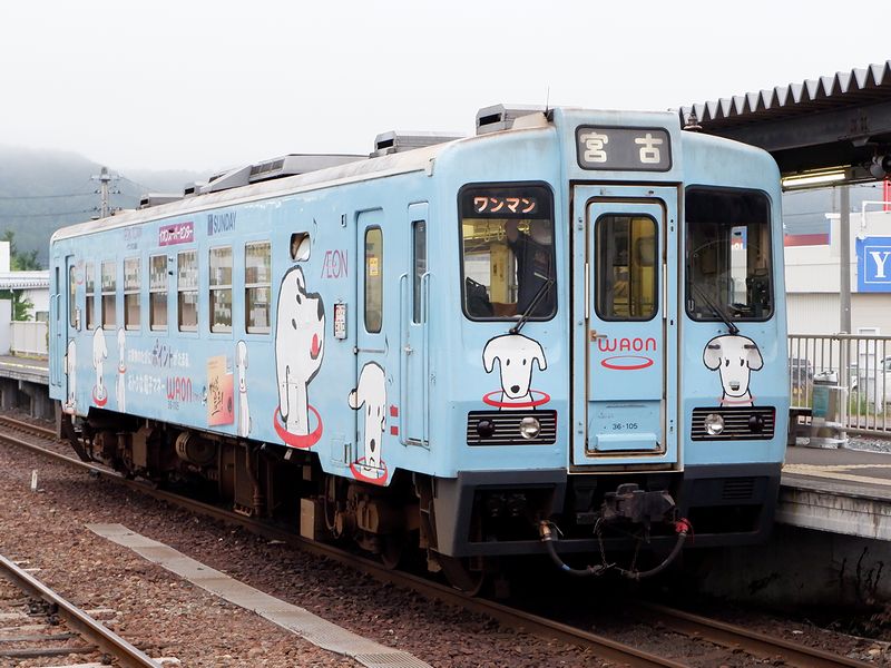 やがて発車時刻の約10分前である16時20分過ぎ、改札が開始に。並んでいた列の2番めからホームに入ると、1両編成で停まっていたのは塗装こそ某スーパーセンターの電子マネー犬が描かれているものの、車両そのものは36-100形(36-105)という、昭和59年(1984年)に三陸鉄道が開業した当時に導入された車両。今回の旅で是非乗りたいと思っていた車両が当たってそれを喜んだのも束の間、列車に乗り込むと、始発列車にもかかわらず海側のボックスシートの、一番景色が堪能できるであろう前に向かって座る窓側の席は、ほぼほぼ埋まっている状態。先に到着していた釜石駅からの三陸鉄道の列車から乗り継いだ人たちでしょうかね?で、先程私の前に並んでいた人が、残っていた最後の1席に着席。ここで心が折れ、運転席横の最前部に立って景色を眺める選択もあったものの、空いていた山側のボックスシートに座ることに。まぁ、景色が見たければもう一度来れば済むことだし、今回は昭和59年(1984年)製造だけど、その後様々な改良工事が施された36-100形の乗り味を堪能することにしましょう。でもこんなことになるのがわかっていたら、宮古駅の駅そばに寄っても良かったよなぁ……。