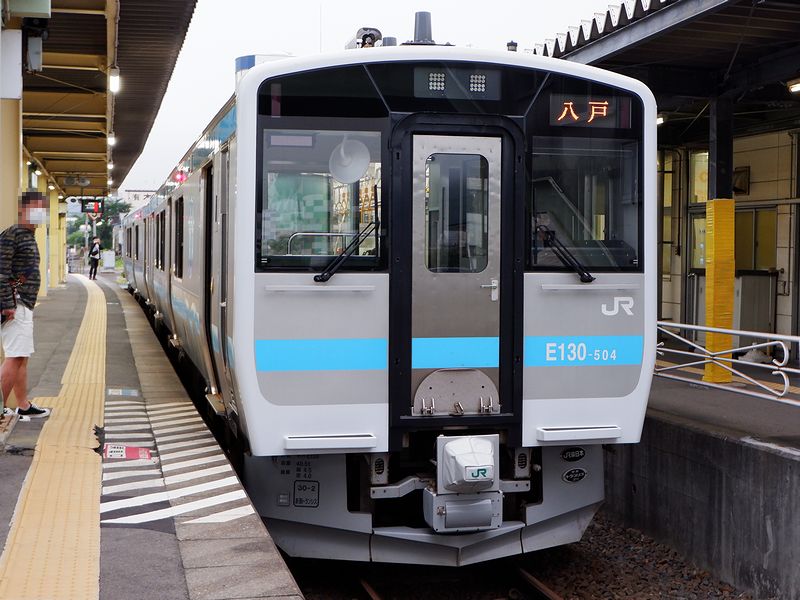 ちなみにこのキハE130系、最初に投入された0番台が水戸駅と郡山駅(正確には安積永盛駅)を結ぶ水郡線で、その際に余剰となったキハ110系100番台気動車が、先に乗った山田線の旧型車両置き換えに使われました。それで今回乗る500番台は、平成29年(2017年)より八戸線の旧型車両置き換え用として運転を開始した形式。両運転台のキハE130形、片運転台で2両1ユニットを組むキハE131形(トイレ付き)とキハE132形の3形式があり、車体はキハ110系と比較して全長は同じ20m級ですが、全幅は約2.8mに対して約2.9mと広く、扉配置も片開き2扉に対して両開き3扉とラッシュ時の収容人員や乗降性を重視しています。また(500番台の)車内は、ドア付近がロングシート、ドア間はボックスシートのセミクロスシート配置ですが、ボックスシートは片側が4人掛け、片側が2人掛けとなっています。