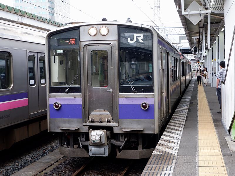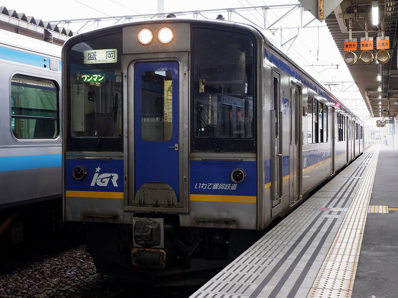 その1番線ホームで待っていると青森方から入ってきたのが、乗り入れ先であるIGRいわて銀河鉄道所属のIGR7000系電車。JRで言うところの701系電車で、オリジナルは平成5年(1993年)に登場。2両・3両・4両編成の交流電車で、それらを組み合わせて最大8両編成まで対応可。全長20m級の車体は正面に貫通扉を持ち、側面片側に幅広の両開き扉を3か所設置、車内はオールロングシートという通勤に適した仕様になっていて、それまで東北地区の普通列車で使用されていた客車列車(12系2000番台客車や50系客車)、455・475系急行形電車、元は寝台特急用だった715系電車1000番台といった、ドアが狭くて枚数が少ないため通勤時の輸送に向かなかった車両たちを次々に置き換えていきました。で、この車両。先述のとおり当初はオールロングシートだったため、東北地方を旅行する、主に青春18きっぷ利用者などには蛇蝎のごとく嫌われたのですが、後に登場した秋田地区向けや第3セクター向けの車両では、ロングシートの他にボックスシートを配置したセミクロスシートとなりました。