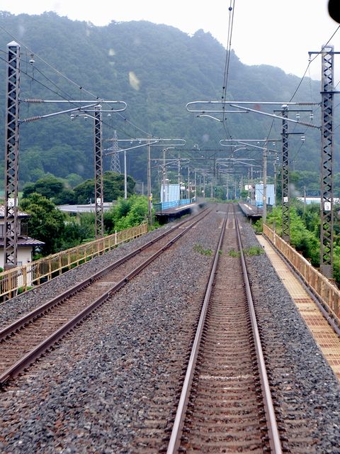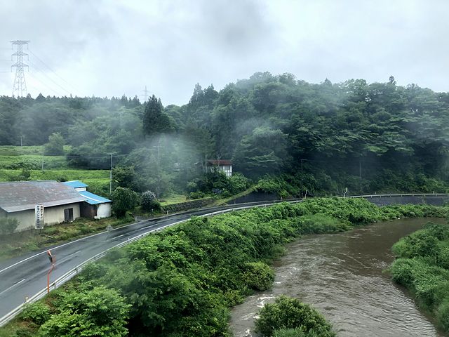 というわけで、お弁当のお供はビールではなく車窓からの風景。ですが、雨はだんだん強くなってきているようで、車窓に付く水滴の量が増えてきました。そんな中列車は、鍋鉉線を北から東へと進路を変え走ります。この大船渡線も、昨日乗った釜石線や山田線同様に、北上山地を超えていく路線ではあるのですが、沿線の印象は、山田線よりも開けているけど、釜石線の遠野駅以西よりは山の中という感じで。