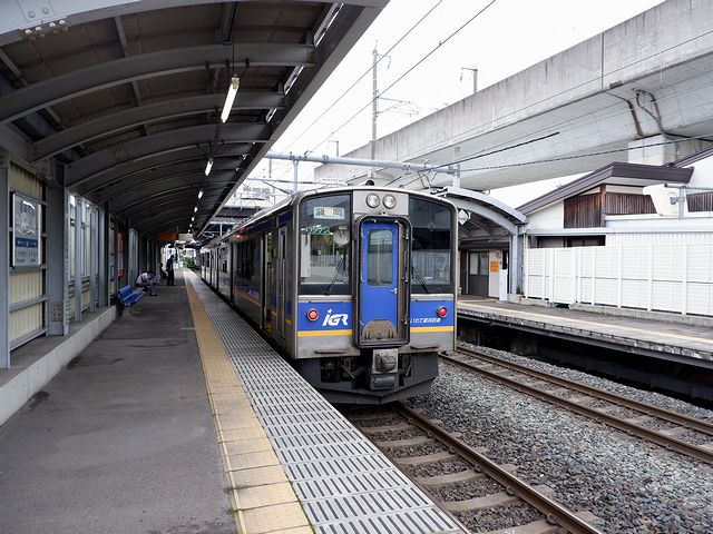 ですが、入線した時に見えた車内に正直がっかり。というのもIGRいわて銀河鉄道のIGR7000系電車は、自社発注した100番台とJR東日本から譲渡された0番台とがあり、その車内は100番台がセミクロスシート、0番台がロングシートなんですよね。で、この列車は見事に0番台。しかもここで100番台に当たらないと、今日、クロスシート(ボックスシート)に座るチャンスが大幅に減ってしまうという。もっとも、ロングシートだろうと何だろうと今更どうにもならないので、諦めて2両編成の後部、IGR7001-4に乗車。私を含め編成全体で3名の乗客を乗せ、ワンマン運転の列車は定刻を迎え発車しました。
