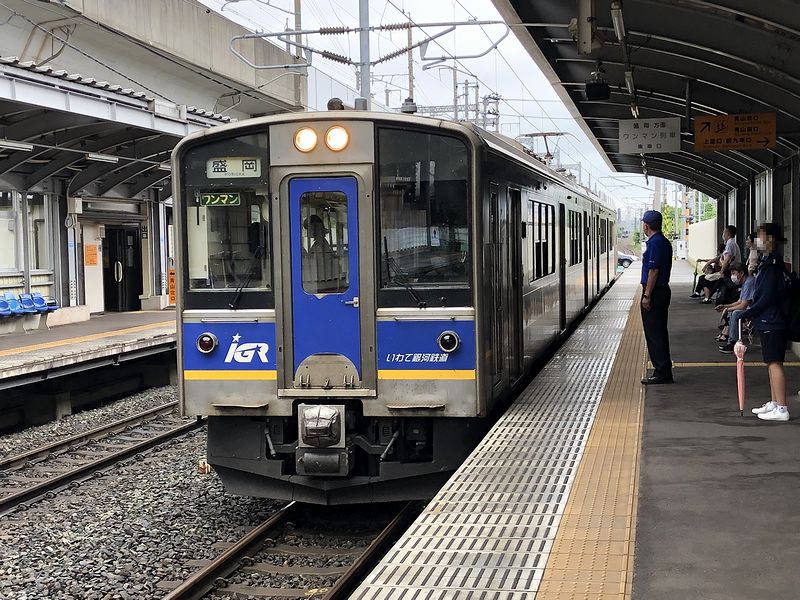 そして当然のごとくホームに停車していたのが、若干赤みがった青色の帯を巻いた盛岡地区用の701系1000番台2両編成です。その写真を撮ってから後部のクモハ701-1021に乗り込めば、車内は当然ロングシート。その席は半分以上埋まり、立つ人が若干出るくらいの乗車率で発車。それにしても、さすがは今日(令和2年7月25日)現在で新型コロナウイルス感染者ゼロの岩手県。車内には、若い女性や年かさの男性など、マスクを付けていない人もちらほらと。