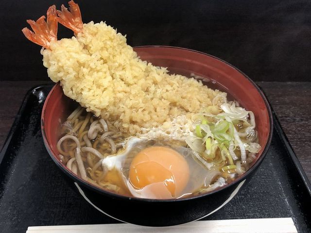そこでせめて前回と違う品をということで、えび天そばに生卵を追加したものを注文。いただこうと顔を近づけたところ、ちょっと煮込んだ感じの風味のあるツユが、以前いただいた時もそうだったなぁ、と。で、その匂いを一味で殺しつつ、丁度よい濃さのツユを啜り、ツルッとした口当たりで柔らかい食感のソバを啜り、載せる前に電子レンジで温めてくれた海老天を齧り、途中から生卵を崩して味変しつつ完食。