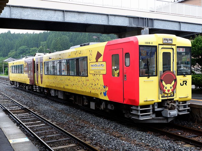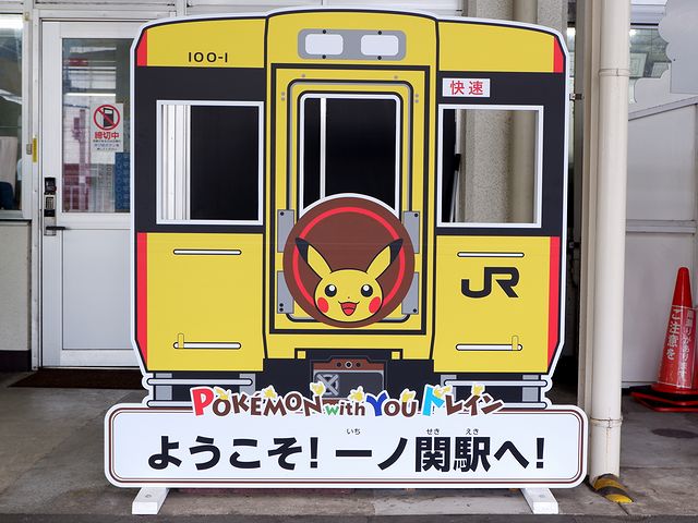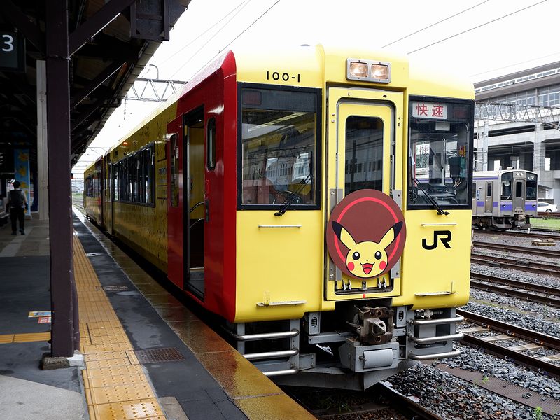 それで先程改札口を入って以来、1番線ホームに鎮座している他、跨線橋、そして大船渡線の列車が発着するホームの駅名標と、駅構内のいろいろな場所にあしらわれた「ポケットモンスター」の「ピカチュウ」が次々と目に入るのですが、この数々のピカチュウの原因たる列車に、これから乗ることに。それが、快速ポケモントレイン気仙沼号。JR東日本が保有するジョイフルトレイン(JR東日本的には「のってたのしい列車」)「POKÉMON with YOU トレイン」を使用して、一ノ関駅-気仙沼駅間に運転される臨時列車です。