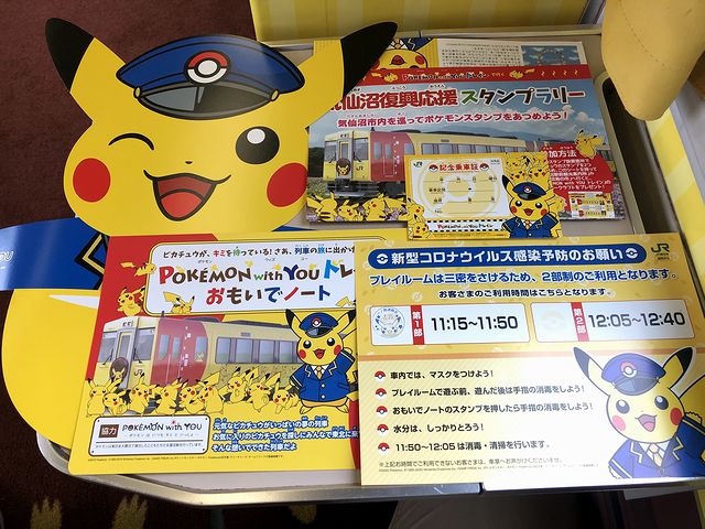 ここからはそんな罪悪感に動揺してちゃんとメモを取っていなかったため時系列があやふやなのですが、車内放送はお姉さんとピカチュウのスペシャルなものだったり、アテンドさんから乗車記念のグッズ類やスタンプ帳を配られたり(年かさの男性は断っていたもよう)、プレイルームは三密を避けるため座席番号による2部制となる案内がアテンドさんからあったりといったことが、定刻での発車と前後してあったような。それにしても、私のような者にも、ピカチュウの被り物配ったりプレイルームの案内したりしてもらったりして、ほんと申し訳ないですが、お陰で良いお土産が出来ました。
