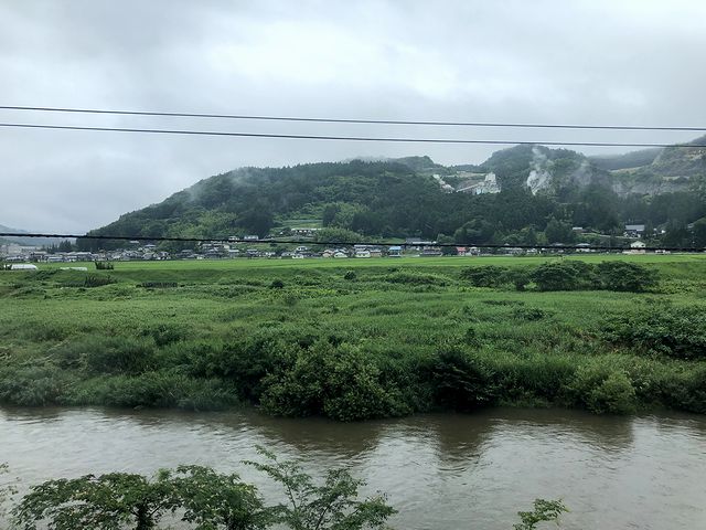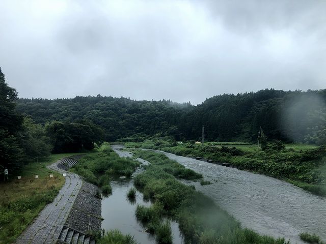 約4分の停車時間で猊鼻渓駅を発車した頃から、先程購入したお弁当で2度めの昼食タイム。かわいい巾着袋に入ったそれを紐解けば、上段左から、クルミ、カボチャ、サツマイモの甘いサラダと、ピカチュウ型に切り抜かれた海苔が載った白米。2段目は左から、エビのフリッター、ゆで卵とブロッコリーの下にピリ辛でトロミのあるひき肉、そしてグラタン。3段目は左から、タマゴとグリーンピースが乗ったケチャップライスと、揚げたポテトの下にズッキーニという、子供が喜びそうな構成。大人でも、こういういろいろな品がちょこちょこと入っているお弁当は、酒のつまみに良いものですが、この列車に乗っている時は、ビールすら飲むのがはばかられるよう。