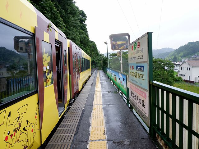 そんな車窓の景色を眺めつつお弁当をいただいていると、久しぶりに?お姉さんとピカチュウの車内放送が流れ、摺沢駅に停車。というのもこの摺沢駅では、ちょっとしたイベントというか、待合室のピカチュウと記念撮影が出来、また先程アテンドさんからいただいた「おもいでノート」に捺すスタンプが置いてあるそう。なので、約7分間の停車時間の間に、約家族連れの後について、私もそれらを。居心地の微妙さはあるものの、せっかく「のってたのしい列車」に乗ったんだから楽しまないとね。