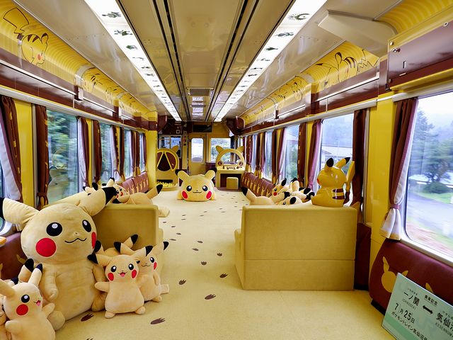 まずPOKÉMON with YOU トレインですが、株式会社ポケモンのデザインにより、キハ100形気動車(16m級の片開き2扉の車体に、トイレ付きセミクロスシートの室内の両運転台車両の気動車)のキハ100-1、キハ100-3をベースに改造され、キハ100-1は「コミュニケーションシート車両」として全席クロスシート(ボックスシート)に、キハ100-3は「プレイルーム車両」としてシートを撤去して高床式のプレイルームを設置しました。で、平成24年(2012年)12月からポケモントレイン気仙沼号として運転を開始し、当初は「ポケモンはいつもキミといっしょ」をテーマとした内外装になっていましたが、運転開始後5年を経過した平成29年(2017年)7月に「親子でピカチュウと楽しむ列車」としてリニューアル。内外装ともピカチュウの黄色をベースに、赤、茶色で塗り分けられた他、沢山のピカチュウがそこかしこにあしらわれたデザインになりました。