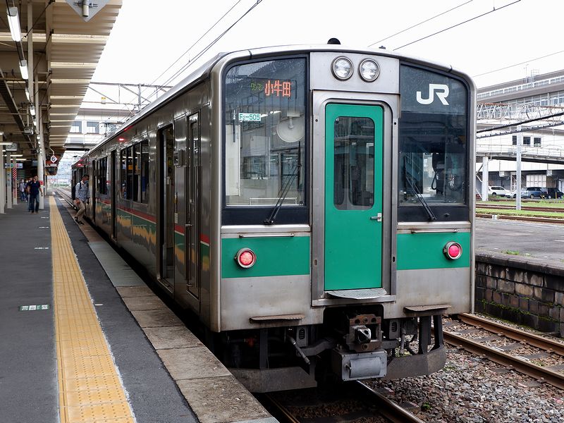 というわけで駅で少し待って、14時41分発の小牛田行き普通列車に乗車。車両はもう説明不要の701系電車で、緑の帯を巻いた仙台地区用の車両です。その2両編成後部のクモハ701-1505に乗車。車内は当然ロングシートで、ワンマン運転のためか、出入口のある先頭車両はロングシートあたり5,6人、この車両はロングシートあたり2,3人の客を乗せ、一ノ関駅を発車しました。