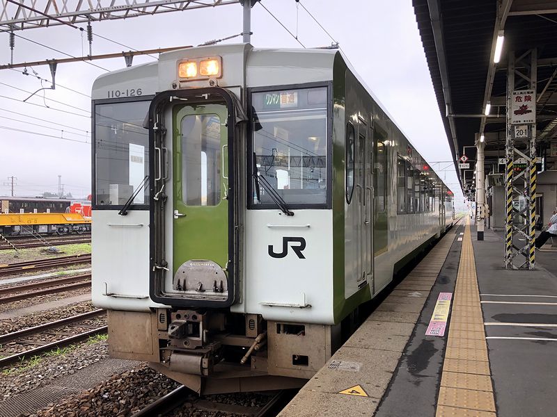 待合室で時間を潰したあと、改札が始まったので跨線橋を渡って石巻線の列車が発着する4番線ホームへ。停車していたキハ110系の2両編成はなんと、一昨日に石巻駅-女川駅-前谷地駅と乗ったキハ110-126とキハ110-123でした。その先頭車だったキハ120-126に乗車。各ボックスシートに1人くらいの乗車率で小牛田駅を発車しました。