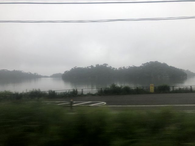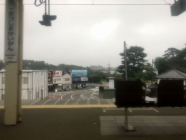 東矢本駅出ると、今度は車窓に水田が広がるのですが、霧が出ていてなかなかに幻想的。陸前小野駅で、今度は仙石東北ラインの快速列車と交換。発車後、東日本大震災の復旧の際に切り替えられた新線に入り、鳴瀬川を渡って間もなく水田から山へと。そして東名駅をて山を抜けると、松島の海が。駅のところの防潮堤は高くなってるんですね。で、ここも霧が出ていて、良い雰囲気です。