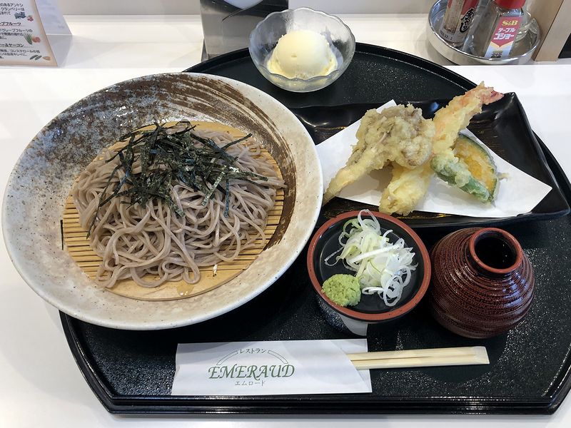 登場して早速猪口にツユを注ぎいただけば、こういうところでいただくには悪くない味。特筆すべきものはないというと失礼ですが、ソバはツルッとした口当たりにコシもあって、醤油っ気と塩気、甘味のバランスが自分好みのツユはしっかり濃い目が嬉しく。天ぷらは当然揚げたてサクサクだし、それに、フタバ食品のアイスクリーム(ちなみにこのレストランの運営は、サクレでお馴染みのフタバ食品です。)がついてくるのも嬉しいですね。