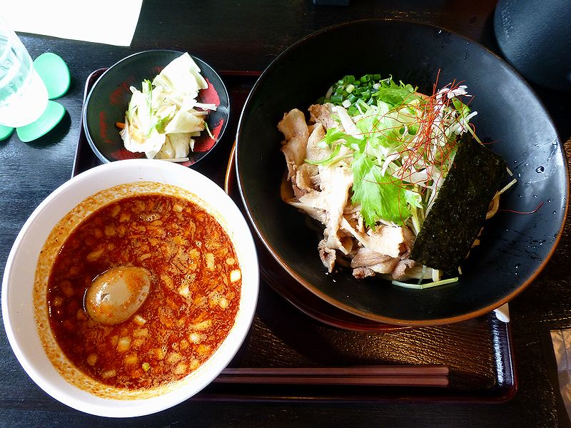 というわけでいただいたのは当然こちらとなるわけなのですが、今回は、ちゃんと麺の量200gで注文することが出来ました。で、登場した辛さ2倍つけ麺。先週いただいたノーマルの辛さに較べると、付け汁がより赤々としているような気がするのですが、早速低加水のソリッドな太麺を付け汁に浸けていただけば、確かに、ノーマルよりもパンチ力が倍増しているような。ですが、ベースとなっている鶏白湯がかなり濃厚なので、このくらいパンチが効いた方が、味がよりシャープというか、エッジが効いて伝わってくるように感じられました。