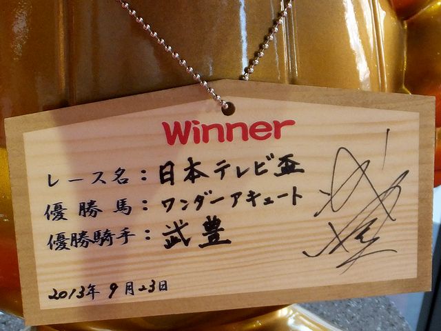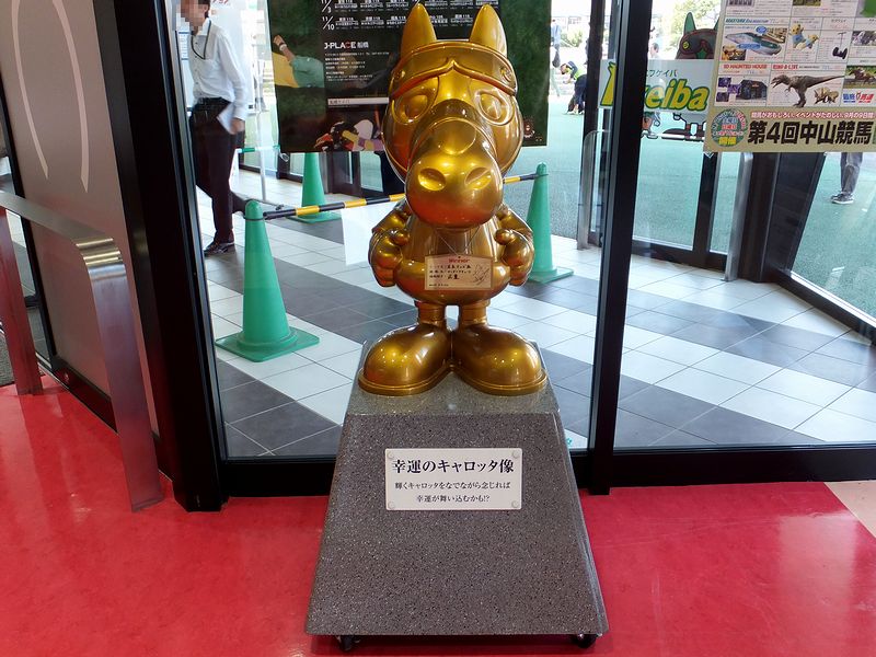 アタリーナの中には、黄金に輝く幸運のキャロッタ像が鎮座。そしてその首には、先日行われた第60回日本テレビ盃をワンダーアキュート号で優勝した武豊騎手のサイン入り『幸運の絵馬』がかけられていました。ちなみにこの幸運の絵馬ですが、重賞競走ごとにその勝利騎手のものに取り替えられていくそうです。