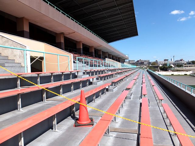 コースの直線一杯に広がる巨大なメインスタンド。ですが、東側の一部区域については立入禁止となっていました。で、ちょっと珍しいなと思ったのが、スタンドが継ぎ接ぎというか、地方競馬で良くある(JRAでも新潟とかがそうですが)建築時期の違う複数の建物が繋がっている構造ではなく、大きな1つの建物になってところ。それと、1階部分に屋外観覧席が無いのも珍しいというか。